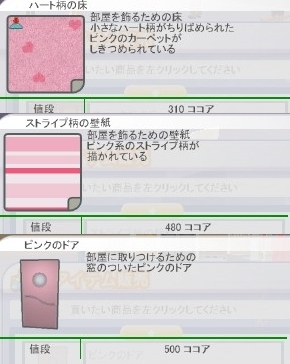 2009/11/03 Category : meet-me 兜と笹塚2回目 新宿の抽選所では2~6等まで当たった事はあります。しかし原宿では6等、たまに5等しか当たらなかったのですが。なんといきなり2等が当たりました!景品は「新聞紙の兜」でした、2等なのに新聞紙ってww虫取りに行く前に被ってみました!なんか恥ずかしい。続きは長くなるのでたたんでいます。 一応被ったまま虫取りをしていた所「四葉のクローバー」を見つけました。身に着けるアイテムでもなさそう。石みたいに庭に置くタイプのものかも。ココアが貯まったので壁紙と床を買いに笹塚に来ました。笹塚のホームセンターは駅から結構走ります、服屋は近いのに・・・。床はハート柄、壁紙と寝室に続くドアもピンクしましたw勿論2階の部屋に使います。とりあえず今日はこの3つにしました。家に帰って模様替え完了、見事にピンクまみれです。2階部分は(だけ)ちょっとはまとまってきたような目がチカチカするような・・・。 PR