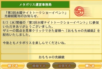 2011/08/18 Category : meet-me 抱きしめて!MMの果てまで この間ザミーと戦った時のアイテムが届きました。おもちゃの光線銃、何に使うんだろう。びょびょびょーという音を立てて光線を撃てました。人に向けて撃ったらNG?金箱から出たアニメーションパッチ。決めポーズですがどういう状況で使うんだろう?光線銃で敵を撃退→このポーズ?自宅のテレビでは7月にPSHomeで行われたマクロスの時空ライブの映像を流しています。PSHomeはセカンドライフのようにリアルなアバターで仮想空間でいろいろあそべるゲーム。セカンドライフほど細かくいじれず、アバターもこゆいPSを起動しないといけないのが難点かも。最近はマクロスFのキャラクターがPSHomeに登場して作中と同じく歌って踊るライブなんかもやっていました。ヒロインのライブ中ヴァジュラという敵が襲撃してきたりと迫力、演出もよくて結構楽しめました。MMでもこういうイベントもやってくれないかなあ? PR Comment0 Comment Comment Form お名前name タイトルtitle メールアドレスmail address URLurl コメントcomment パスワードpassword