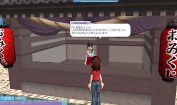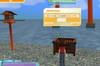 2009/06/13 Category : meet-me 船で移動 今日は船に乗ってどこかへ出かけてみたいと思います。海の上神宮前に着きました、大きな鳥居が見えます。おみくじがありましたが、今はできないそうです。お賽銭箱です、ココアを入れるそうですが今はいいです、ごめんなさーい。ここは鳥居以外は何もないようなので、反対側に移動したら観覧車が見えました。しかし観覧車には乗れないようです。こういうのに乗れるようになれば楽しいのに。
