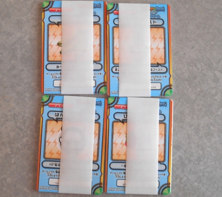 2015/11/26 Category : 電波人間のRPG FREE! ブースターパックも買ってみた イオンでブースターパックが売られていたのでカードダスとどう違うのか購入してみました。 6枚入りで1つ200円(税別)おいこれ税込な分、パックの方が高いじゃん・・・。 レア(右下)1枚とノーマルカード5枚でした。しかもれいダブりました、ガーンだな。 裏はこんな感じ。ブーストはいいアイテムなんでしょうか?つかまえるアンテナは持ってましたがモンスターは捕まえた事なかったな。これはカードダスにも入ってる遊び方やカードリストが載っているカード。こういうのって捨てるか取っておくか迷います。他にも電波人間のブースターパックを買ってみた所レアもしくはハイレアは必ず1枚入っているみたいです。カードダスだと3枚で100円、パックだとレアは必ず入ってるけど税込で6枚216円。運が良ければカードダスの方がお得ですね。しかしお店によってはパック1つ180円、190円とか安く売っている所もあるのでそうなると圧倒的にパックの方がお得になります。今はカード第二弾が出ています。店舗検索した所、第一弾に比べ取扱い店舗が周辺に全く無い・・・。カード入りの入浴剤は近くのイオンでも売っているようなので今度はそっち買ってみようと思います。