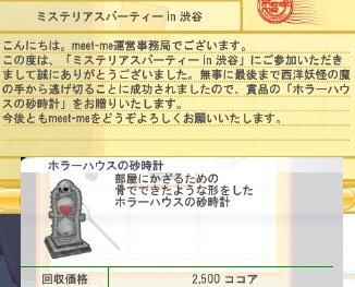 2012/11/05 Category : meet-me いたずらしかなかった 前に渋谷で行われたハロウィンイベントエラーミステリアスパーティの賞品アイテムが届きました。賞品はホラーハウスの砂時計。ホラーハウスって何処?残りのハロウィンお菓子の結果です。プリン以外はダブりだなぁ・・・。配られるお菓子は沢山種類あるみたいなのに偏り過ぎじゃないですか?カードデッキ、第二軍のビービーがついにクラスチェンジ。ビービー達は原宿の抽選アイテムで貰えるので第一軍のカード(クワールやデスカマー)よりレベルが上げやすいです。もしかしてレベル追いついちゃうんじゃないのか・・・。先月~今月は必死でガチャに並んだので200MMPの土地券はなんとか集まりましたが、問題は500MMPの土地です。今契約している場所はそこそこ広くて駅も近いのでできれば手放したくない。何よりドンキボールを収納しているので引っ越し片づけがメンドイのが本音wということで銀箱、木箱(500MMP土地券)狙いでぼった館行きました。金クロがポツポツの生えてくれるので助かります。上は銀箱×6と金箱×2。ストローハット以外はイマイチかも。水玉レギンスは可愛い。銀箱×4、木箱×2。はい、とういう事で出ませんでした500MMP土地券!なんで今更200MMP土地券でるの・・・、今欲しいのは500MMPなのに。かぼちゃの植木鉢ももう季節外れだよ!泣く泣く土地を片付け、大量のドンキボールも移動させました。そして引っ越しが終わり日付けが変わって(11月6日)渋谷の抽選所に行った所。遅いよ!まぁ嬉しいです。ギリギリですが助かりました。 PR