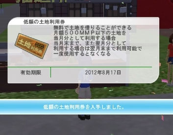 2012/06/28 Category : meet-me どうせスモールチャンス 今回からビックチャンス購入は予約制になりチャンスカード引換券で交換するようになりました。面倒だけどみんな平等に買えますね。自宅に戻り、ESPOの溜まるアイテム(名前忘れた)をクリックしたらこんな通知が表示されました。なんぞや?えー!いきなり500土地券ゲット。というかメタポリスこういう企画やってたのか・・・、知らなかった・・・。お礼言っておきます。ちなみにこの矢印のアイテムです。6月ジューンブライドということで花嫁のドレスに着替えました。無駄に効果かかっています。このドレス、スカートのボリュームが良いですね!もう6月終わるけどね。