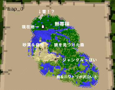 2012/03/28 Category : Minecraft スノーゴーレム 地図。すぐにアイテムがいっぱいになるので何度が自宅に戻りつつ、やっと雪があるらしい場所に近づきました。熱帯林みたいな所が高い木が密集していて先に進み辛い。地図が無かったら確実に迷っていた。雪キタ━━━━━━(゚∀゚)━━━━━━ !!熱帯林に雪というなんとも奇妙な組み合わせ。あ、熱帯林てのは見た印象で本当にここは熱帯林と呼ばれる所なのかは知りません。何故か牛が多いです。雪を大量に持ち帰ってスノーゴーレム完成!可愛い けど顔が無いのがちょっと残念。スノーゴーレムが歩いた所は雪が積もるのでいちいち雪を取に行く必要も無く超便利。ただ問題がコイツ想像以上に弱い。下手すると作った瞬間死ぬ、5回作り直しました。敵を見つけると雪玉で攻撃しますがダメージは0、ただ後退させるだけ。水(雨)に触れたり砂漠(砂ブロック)に行くとダメージ受けて死にます。これは観賞用か雪ブロック回収用にするしかないか…。カボチャは後ろにある畑でいくらでも回収できるし。洞穴を見つけ降りてみた所、何やら木材ブロックを発見。もしかしてこれが噂に聞く廃坑ってやつですか!モンスターが多いけどお宝もあるという。準備してから行ってみようと思います。 PR
