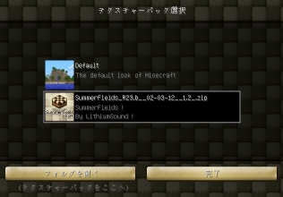 2012/03/08 Category : Minecraft テクスチャーパック テクスチャを変更してみました。デフォルトからSummerFieldsという絵本のような可愛い模様の多いテクスチャにしました。これがデフォルト。SummerFields。丸石が美味しそうな感じに木材がベージュ→こげ茶の板のようになりました。デフォルトのイベントリ画面。SummerFieldsのイベントリ画面。スキンを変更しただけでずいぶん印象が変わりました。しかし模様がガラッと変わったので鉱物の見分けがつかないかもしれません。ちなみにテクスチャ変更についてはこのページ(日本語wiki)テクスチャは非公式日本ユーザーフォーラムから選びました。しかしPCによってはテクスチャ変更で不具合が出たり元に戻せなくなったりするようなので自己責任で。
