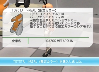 2011/10/22 Category : meet-me i-REAL バニー用のハイヒールがトレボで売られていたので即買いました。有料なだけに良く出来ています。光沢もあってセクシー!i-REALを買おうとメタポリスのショップに行きました。これに乗ると走るよりも早く移動できるみたいです。1万5千ココアもするのでどのカラーにするか激しく悩む。散々悩んで白とオレンジのカラーにしました。原色ばかりじゃなくてパステルカラーの可愛い色とかないんだろうか・・・。早速乗ってメタポリスを疾走~。早い早い!これで宝箱探しも滾りそう。リアルでこんな乗り物欲しいな。 PR