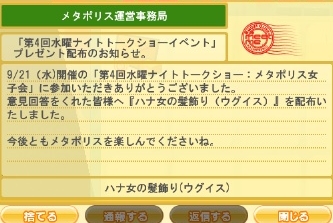 2011/10/03 Category : meet-me 突き刺さるプリン すごい・・・。これどうやったんだろう?この前参加したトークショーのアイテムが届きました。ウグイス?ウグイスって色の事か。赤色の花飾りは持っていたのでタブらなくて良かった。開けられた後ですが、大きな木箱を発見しました。話には聞いていましたが本当にでかいなー。何が入っていたんだろう?3枚目のカード作成。今度のは強そう、あとは技カードとやらを作ろうかな?また抽選所でベースカード当たったらだけど・・・。