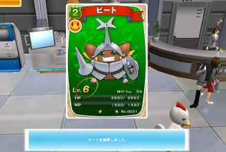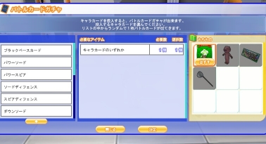 2011/10/10 Category : meet-me カードバトル ベースカードをまた手に入れたのでカード2枚作ってみた。左はノコギリクワガタとオオクワガタで出来るキャラカード。右はキャラカード1枚で交換できる技カード。技カードはカードガチャにキャラカードを入れてできます。一番弱そうなグラッパを犠牲にして技カード「ダウンソード」を作成。よく分からないけど、バトルしたいのでデッキを作ってみる。キャラカード3枚と技カード1枚で1個のデッキ完成。技カードは無くてもデッキが作れますが無いと戦闘キツイです。教官が練習相手になってくれるそうです。イマイチ分からないままいざ勝負!なんとか勝てました。この調子でロビーにいるフリーバトラー(勝つとアイテムが貰える)に挑戦しましたがどれもレベルが高くて負けてしまいました・・・。虫はともかく肝心のベースカードは滅多に手に入らないアイテムだしカード作ったばかりの初心者にも勝てる相手をそろえてほしいんだけど。 PR