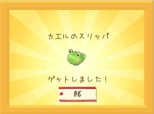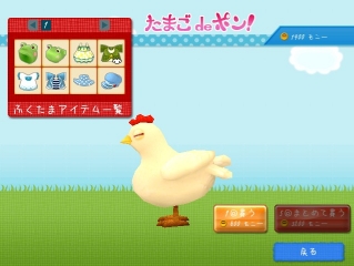 2011/06/25 Category : モネモ~ネ たまご de ポン! モネモ~ネにもガチャのようなシステムもありました。普通にアイテムを買うより、こっちの方が値段も安い気がしたので1回だけやってみます。ニワトリがランダムでアイテムの入った卵を産みます。カエルのスリッパでした。可愛いし、まあいいか!はかせてみましたが見えづらい・・・。家具もちょっと増えました。レベルが上がったらテレビが貰え、モニーが貰えるミニゲームができるようになりました。クリックで障害物をジャンプでよけつつコインのモニーをゲットするミニゲーム。3回ダメージを受けるとゲームオーバー。操作もクリックのジャンプだけで簡単です。早くモニー貯まらないかな。