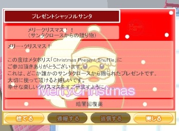 2010/12/30 Category : meet-me クリスマスのプレゼント ログインしたら手紙が2通届いていました。前に参加したプレゼントシャッフルのようです。アイテムを2つプレゼントボックスに入れてたんだっけ。暗闇回復薬と銭湯の置物を貰いました。ん~、なんだか私には勿体無いようなアイテムですな。回復薬はダンジョン用アイテムっぽい。いつかダンジョンも行って使いたいと思います。続きは長くなるのでたたんでいます。 つづきはこちら