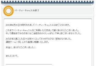 2010/09/06 Category : パーティーキャッスル ついに・・・ パーティーキャッスル終了のお知らせ。シンセに続き、ユーザーがアバターを作れるゲームが終わってしまいました。シンセより賑わってると思ってたんだけどな。終了するなら今まで撮影した画像保存しておくんだった(´・ω・`) PR