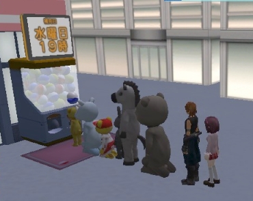 2011/01/06 Category : meet-me 新年 meet-me内でもクリスマスからお正月仕様になりました。これはメタポリスで撮影。メタポリスの抽選所のアイテム。変なおっさんのうちわです、冬にうちわかよ。あおぐアニメーションもついてます。市場前の5等アイテム、おそらく豆まき用(消費アイテム)。一回投げただけで消えてしまいました、画像だと5回くらい投げられる量に見えるけど・・・。続きも長くなるのでたたんでいます。 アトラクションチケット2枚余っていたので館に行きました!1回目は何も空けられず撃沈、2回目は運良く銀箱。出てきたのは「石のブロックパーツ」ブロックパーツ使えん・・・・。しかも2回目だし、回収ボックス行きです。新宿周辺をウロウロしているとmeet-meストアー発見。近くによってるとガチャの前に列が出来ていました。どうやら今の時間帯はガチャアイテム補充日だったようです。今までは補充日に遭遇した事がないのでガチャ初挑戦してみることに。いい物が出て来る事よりちゃんと並べて回せるかが心配ですw結果1回目→黒い文字Tシャツ、2回目→壁に貼る英語?そして3回目で鍵出現。4回目は銭湯の置物ピンクでした。すぐにいいアイテムが出てしまったのでたった4回で終わり。他にも土地チケットや服がありましたが緊張してよく見る余裕なしでした。部屋に置いてみた。 PR
